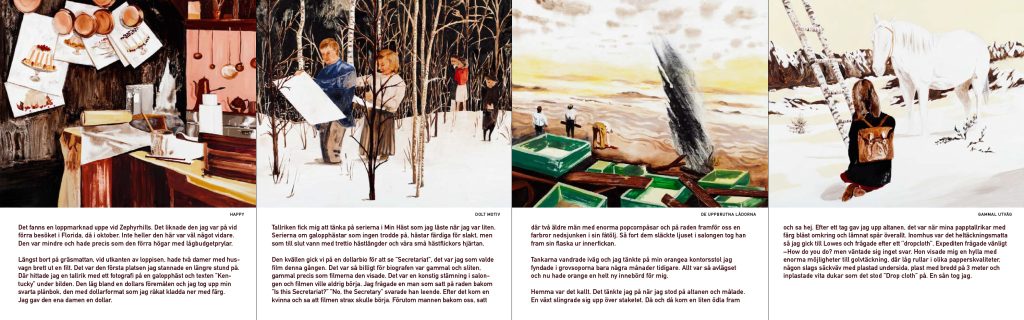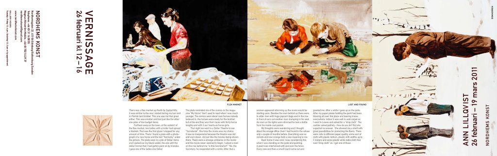 Utställningskatalog, affisch för kulturtavlor på stan, vernisageinbjudan, skönlitterär bok omslag och inlaga.